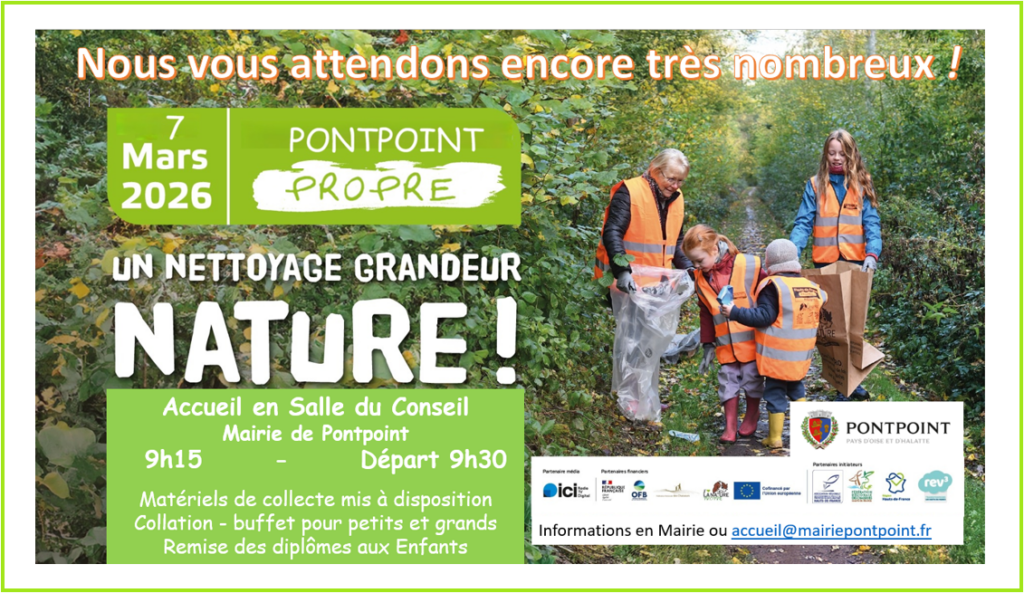 La commune de Pontpoint vous invite à participer à une grande opération de nettoyage de la nature le samedi 7 mars 2026. Ensemble, prenons soin de notre environnement et de nos chemins 🌱